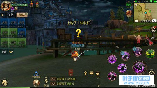 无论是图一的斜坡,还是图二的水泥地,这名玩家带着鱼竿一路行走一路钓。 而且系统一直在提示“鱼儿上钩了,快收杆。”