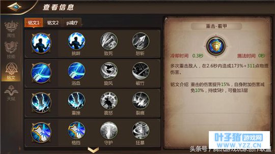 重击-着甲:PVE必选的铭文技能,重击附加伤害减免10%,可叠加3层,此铭文技能可以大幅降低战士受到的伤害,这是战士的基础PVE铭文技能。
