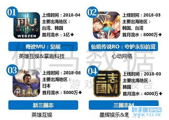 2018年8月以来,国产移动游戏捷报频传。一方面,在国内市场,《我叫MT4》首月月流水破10亿,成为今年表现最好的新游之一;另一方面,游戏企业出海也取得突破。据伽马数据统计, 2018年8月,月流水超过2000万的出海游戏产品达到了38款,其中2018年新上线海外市场的游戏产品达8款。 伽马数据认为,国产移动游戏产品能否在海外市场取得成功主要受到外部因素用户获取、内部因素产品质量双方面的影响。 伽马数据(CNG)近日发布《2018年8月移动游戏市场简报(内参版)》,对8月游戏市场基本状况,TOP20产品收入流水、产品热度、新游收入、产品买量、移动游戏直播、移动游戏出海等数据进行监测与分析。 报告指出,暑期强档,各游戏企业使出浑身解数,力争市场份额,8月收入榜排名波动剧烈。同时,国内游戏市场正处于强监管时期,市场激烈竞争,企业亟需新出路,游戏产品出海成为国内游戏企业的突破口。在此背景下,中国移动游戏出海业务得到飞快发展,目前国内企业在海外的市场表现更加出色,移动游戏产品竞争力强劲,出现海外市场首月流水破亿元等案例。 以下为《2018年8月移动游戏市场简报(内参版)》摘要,该报告仅为内部参考,还包括更全面的产品排名,流水推算等数据。现限量免费发送,欲获取报告请联系工作人员(微信号:vincent795280)。 以下为报告摘要: 《我叫MT4》首月流水破10亿 收入榜排名波动较大 8月份,卓越游戏研发腾讯代理的新游《我叫MT4》上榜,排名第二。 据伽马数据测算,其首月流水超10亿元,收入榜排名超过长期表现稳定的《梦幻西游》位列第二。取得这样的成绩,《我叫MT4》主要受到三方面的优势影响。 第一,用户优势。 《我叫MT4》为《我叫MT》IP系列的第四款产品,沉淀了大量用户基础,加上腾讯游戏代理,用户优势突出。 第二,产品优势。 《我叫MT4》上线后受到用户好评,无论在画面、声音、游戏机制的设计层面,还是操作效果、游戏世界观、用户服务等升华层面都受到了用户认可。 第三,游戏类型优势。 MMORPG游戏商业化程度已经较为成熟,在获取用户基础与用户认可后,使得《我叫MT4》的市场表现得到增幅。 同时, 8月份的移动游戏收入榜也出现了较大的变动。 除《我叫MT4》外,《圣斗士星矢(腾讯)》《梦幻模拟战》等当月上线的新游也成功入榜,挺进前十。 此外,《阴阳师》《崩坏3》在新游冲击下,排名反增,在8月iOS游戏日畅销榜中均冲上过第二位。 这主要受到其发行企业网易游戏与米哈游运营策略的影响,其中《崩坏3》的活动量明显增加。 2018年8月移动游戏收入榜TOP10