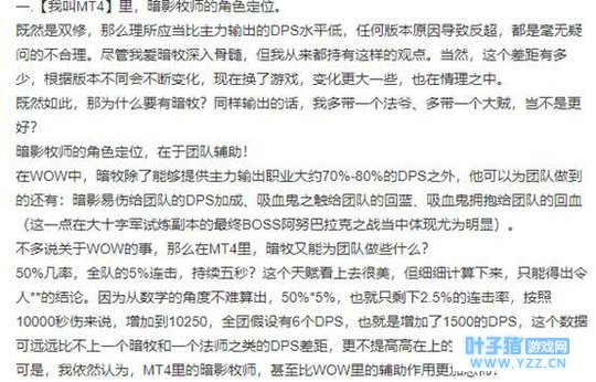 当然,这次更新影响的不仅仅是术士和法师这类远程输出职业,在经过多个版本的沉淀之后,奶妈放下了法杖,化身暗牧驰骋团本。想必各位玩家已经在游戏中见识过暗牧的厉害了吧?双修暗牧不管是输出还是奶量都非常可观,在术士从神坛淡出的这段时间里,暗牧逐渐在游戏中流行开来。下面,让我们来看看贴吧大佬关于暗影牧师的角色定位吧。