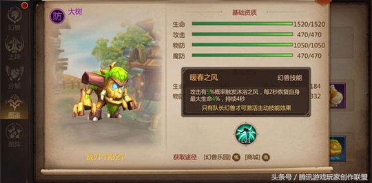 大树的幻兽技能是暖春之风,效果是主人攻击有5%概率触发沐浴之风,让主人每2秒恢复自身最大生命值的4%,效果持续4秒(提升幻兽技能等级可以提高生命值恢复百分比,技能触发概率不变)。