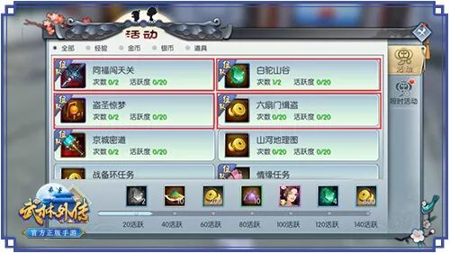 小白科普时间: 咱们武林手游有三大经验副本, 【盗圣惊梦】、【同福闯天关】、【白驼山谷】, 每天均可以完成两次。除了领取 经验、精良碎片、精炼石 等各种掉落奖励之外,还能额外获得活跃度奖励。