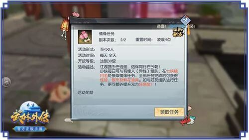 男女搭配组队 到七侠镇找月老接取任务 活动形式: 至少2人 活动时间: 每天(全天那种) 开放等级: 达到30级 根据兔姐经验: 队长一定要是小哥哥!!!!