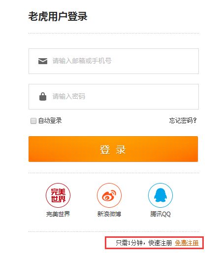 可登录老虎账号、完美世界账号、QQ账号、微博账号等,建议登录老虎账号或完美世界账号。还没有注册账号的客官,点击右下角就可以快速注册账号啦!