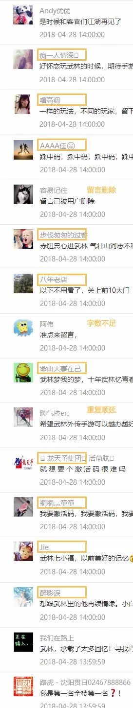 获奖名单我们以后台截图示意。 截图中 微信昵称有橘黄色标注的客官 , 将获得激活码1枚 , 我们今日会通过微信私信为您发放。 字数不足、留言删除、重复踩楼者, 获奖均进行了顺延~