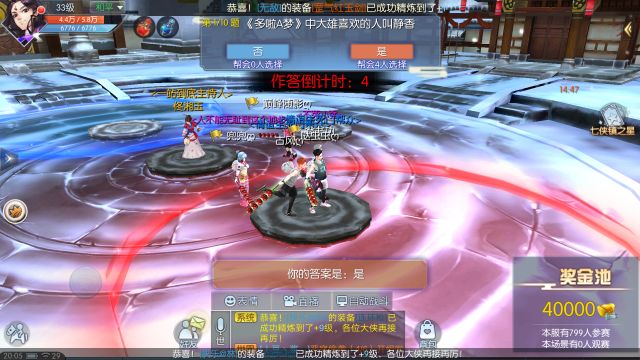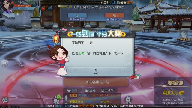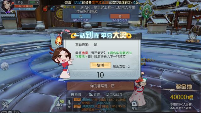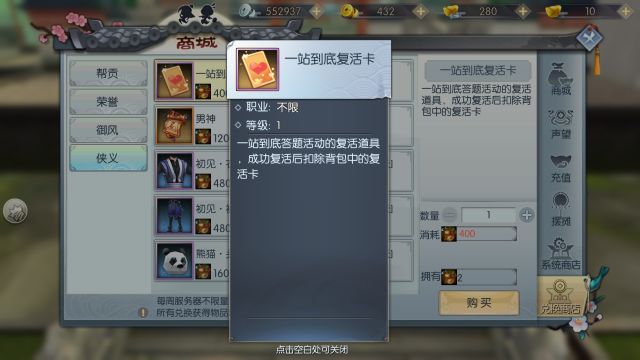 答错的你可选择复活继续参加答题活动, 使用侠义值到商城里的兑换商店, 可以兑换 一站到底复活卡。 传闻每场比赛最多使用2次复活卡~