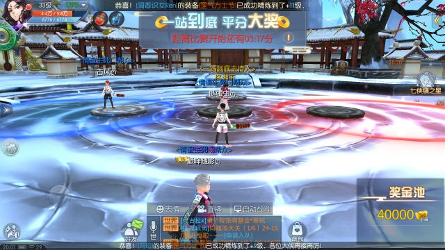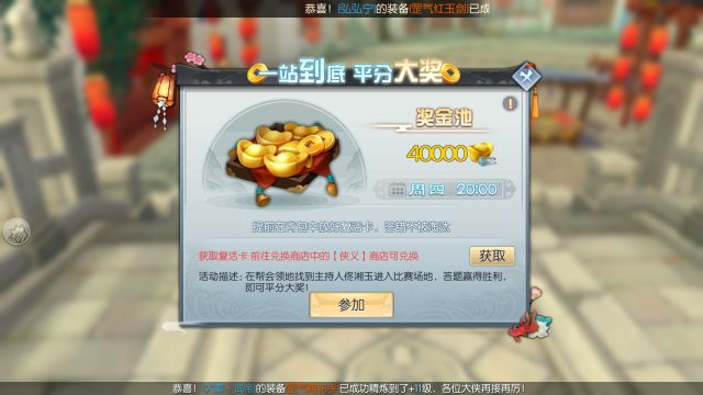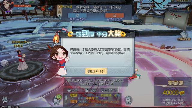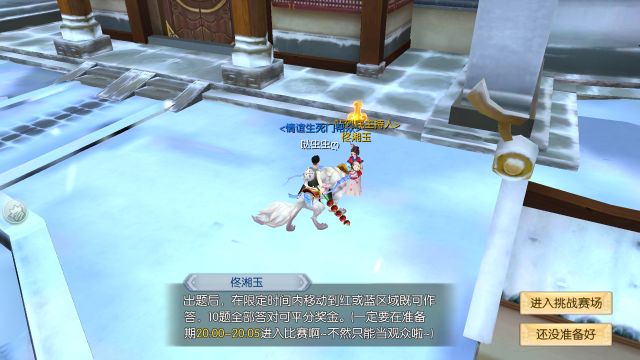 点击参加后会被传送到帮派驻地, 别犹豫,直接朝着佟湘玉奔, 找她要入场资格就对了。 湘玉姐姐会好心提示: 准备期为20:00-20:05 , 这时间段内必须进入挑战赛场, 不然你就只能在场外助威呐喊, 钱都分不到。