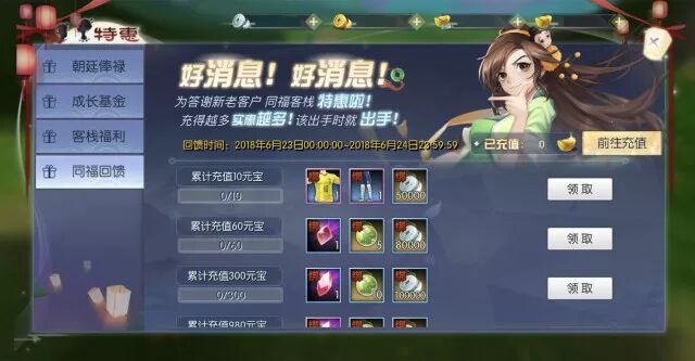 周末惊喜,同福 限时 回馈!活动期间,累积充值元宝数量达到指定额度即可领取丰富奖励。