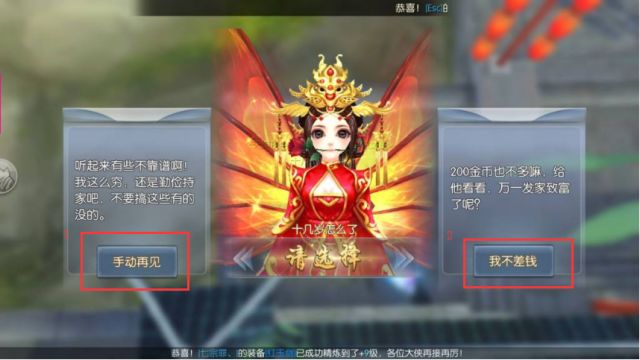 对话之后就会有 “手动再见”和“我不差钱”两个选项, 上面说到了称号是2选1的, 所以……