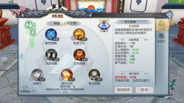 【仙风护体】: 辅助技能,百分比增加自身圆形范围内友方防御值,很强的一个技能,我不加的原因是技能栏只能放8个技能,只能做出取舍。