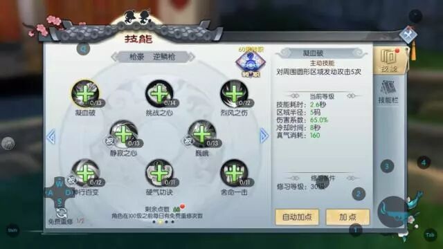 普通攻击 ↓ 暗雷破 ↓ 暴雨梨花枪 ↓ 先天罡气 ↓ 生生不息 ↓ 禁风破1点 ↓ 挑战之心满 ↓ 烈风之伤1点 ↓ 荆棘之心 ↓ 巍峨 ↓ 神行百变 ↓ 硬气公决 ↓ 舍命一击 ↓ 碎梦刀1点 ↓ 养生主 ↓ 巨灵之躯 ↓ 金钟罩