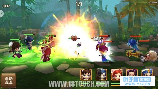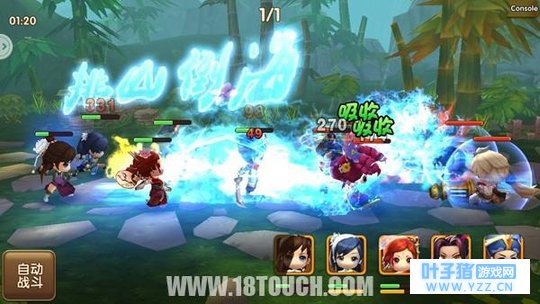 精彩的战斗画面 本作这类“看不到鼻子”的人物画风在国产手游如《花千骨》、《格斗宝贝》中都有运用,但与前者们有所区别,游戏在人物其它五官上刻画更加细致,并加以新颖装饰来凸显人物造型,如为了表现佟湘玉的成熟妩媚,佟湘玉带了点妩媚的妆容,额头还描画了花钿,但丝毫不觉与原作人物有违和感。白展堂带着一脸自信的表情,眉眼间颇有电影真人的神韵。游戏制作十分走心,让人物造型都摆脱了表情呆板。