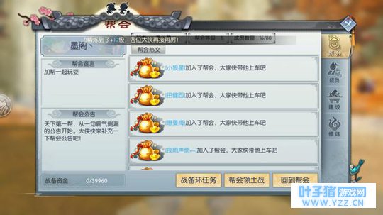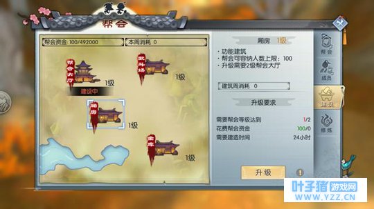 玩家可帮助建设帮会大厅、武斗场、厢房和金库等基础设施,这是帮会实力的体现