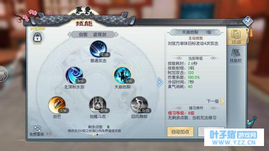 在未转职前,每个职业提供“普通攻击”和5种可升级技能,每个技能对应不同的属性,如耗时、射程、CD时间、真气消耗等,与MOBA游戏类似,不同的技能加点方案让玩家的战斗能力不尽相同,想要成为绝世高手?首先,你得研究一套属于自己的成长方案。