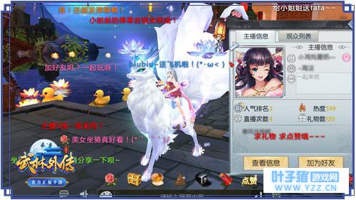娄知县不仅不怒,反而一脸痴汉笑 【一键直播 随时随地秀出自己】 没错,记录下县衙前这一切的就是直播功能。在游戏主界面点击“直播”,就可以创立直播间实时分享你的动态,成为新时代的武林“网红”。当然也可以拜访别人的直播间,窥探一下其他江湖同道的生活,了解别样的江湖轶事。为心仪的主播点赞、献上礼物,看看武林高手们是如何战斗的,偶尔也偷学几手武功绝学!
