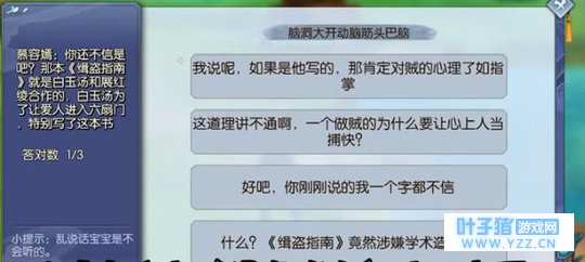 在《武林外传手游》中,有这样的一个趣味答题环节,其中有一段“白玉汤为了让爱人进入六扇门,特别写了这本书”。手游中的题目直呼爱人,是不是已经证明了些什么?大家一起来分析一下 本文来源:今日头条,作者:超神攻略,转载请注明来源。 |