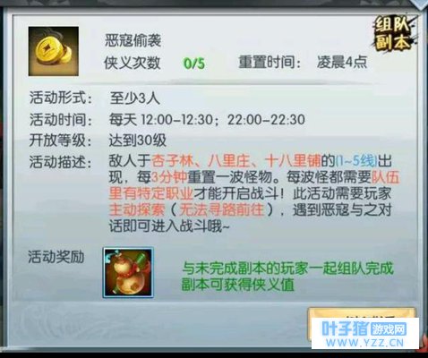 参加时间恶寇活动的开启时间是:12:00-12:30,22:00-22:30。每天会开启两次,客官可以根据自己的时间来选择参与时间。恶寇偷袭每天最多可以参加10次,前5次可以获得活跃值奖励,使用活跃值可以兑换活跃值道具奖励;后五次可以获得侠义值奖励,使用侠义值可在侠义值商城兑换道具奖励。虽然活动开放时间都是整点 ,但是建议提前五分钟把队伍组好哦。