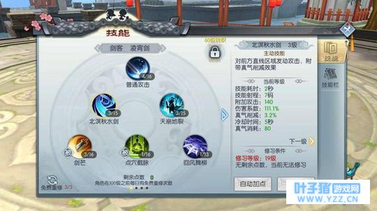 和多数手游一样,攻击技能可通过添加技能点进行升级,且当角色升级达到60级以后,可按个人喜好转职为剑圣或邪皇,选择自己喜欢的攻击技能进行战斗。而在角色达到100级以前,每天都有3次重修技能点的机会,因此各位客官大可不必担心转职后能否更改的问题,可通过比较两种职业之间的区别后再去选择自己真正喜欢的玩法。