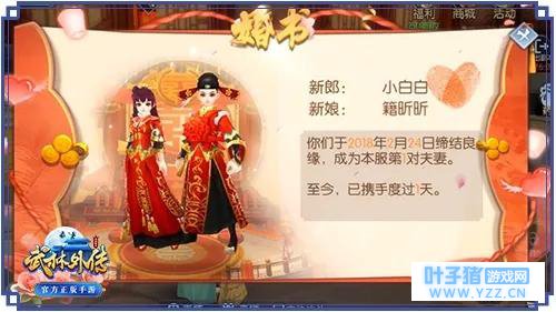 新人在老白湘玉的见证下成婚 【千里情缘自己牵,寻路月老问姻缘】 虽然单身狗散发着独特的清香,但是闻久了也必定会腻,这时就需要ta的出现来温馨陪伴。当然,在出门前别忘了精心打扮一番,选择合适的时装并染个色,光鲜亮丽地出门遇到姻缘的概率更高哦!寻找到属意的有缘人,踏遍武林的山山水水,在ta打怪中增进情感。如果觉得时机已到,二位就可以共结连理,迈入结婚的殿堂喽!