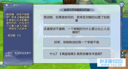 上图,《缉盗指南》是白玉汤为了让爱人进入六扇门特意写的? 除了第四个选项一看就是跑题,剩下的都是模棱两可好吧!第一个顺从NPC意思回答,第二个就是有些委婉的拒绝,第三个明确跟NPC对着干了,你选哪个答案?