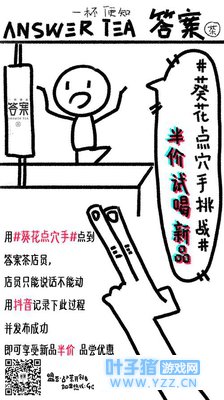 答案茶给你别出心裁的答案 【线下互动 免费享新品】 7月5日-7月7日期间,亲自到答案茶(盟否)门店,在#葵花点穴手#活动中,向店员使出白展堂的看家本领“葵花点穴手”,成功戳中则使其不能行动。用抖音记录这一过程并发布成功,就可以打开新品隐藏菜单,获得“衣兮青梅乌龙”和其他产品。体验游戏乐趣的同时,还可以享受新品优惠,快来施展你的绝世武功吧!