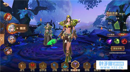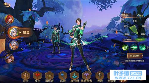 在选好了种族后第二个纠结点有出现了,就是职业选择的问题,其中有战士、斗士、潜伏者、法师、魔导师、黑暗贤者、牧师、圣骑士、射手九个职业,在点击每个职业选项后,都会显示出其重要成长方向与上手难度等介绍,在此处又纠结许久后还是考虑到了自身颇具手残的属性选择了上手难度相对简单的射手职业2333