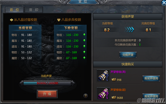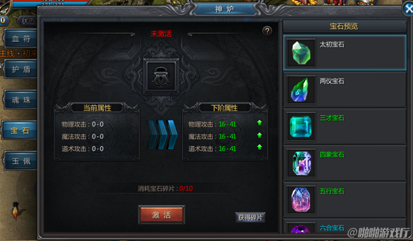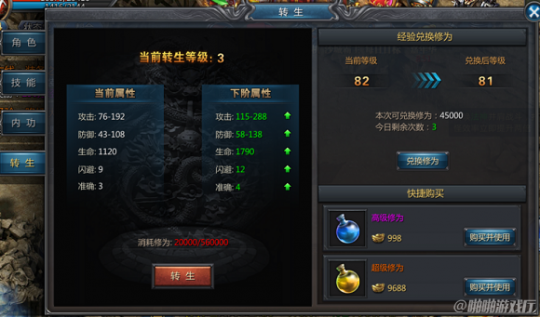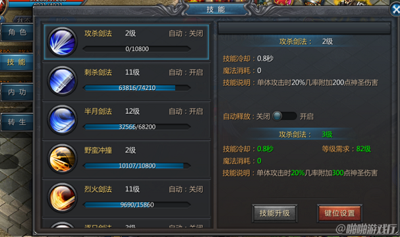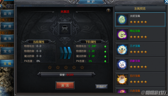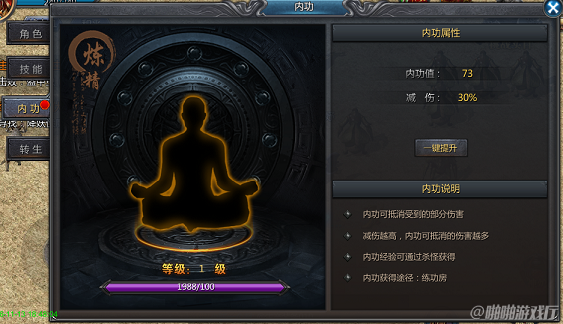 内功系统 内功对于打怪十分重要,强大的内功可以减免大量伤害,大大减少打怪中被秒杀的几率。因此,对于内容的培养显得十分重要。内功系统在角色创建时同时开启,通过主界面的人物按钮即可进入。 内功类似于一个护盾,可以抵消一部分玩家所受到的伤害,同时,内力值具有上限,随时间自行回复。减伤越高,内力值可以抵消的伤害越多。内力值可以通过打怪获得,参加活动也可以获得内功经验卷,使用后可获得大量内功经验。 内功经验可一直累积,经验条满后需要手动点击升级按钮进行提升。 技能系统 每个职业都拥有各具特色的职业技能,具体技能说明可以见下文的技能介绍。 玩家可以在技能界面浏览各个技能的介绍说明和升级技能。并且可通过“键位设置”按钮进入键位设置界面。 在键位设置界面中可以自由设置技能的快捷键。 转生系统 地方上古的道士们无意当中发现了转生之法,通过对精元的压缩与再生,可以极大增强体魄,拥有更强的攻击与防御能力。这种转生之法在不断的流传当中,逐渐完善,现已成为每个传奇大陆的勇士必修的炼体之术。 玩家在80级可开启转生系统,通过点击角色按钮可进入转生界面: 转生分为12个等级,等级越高可获得更多的各项属性加成,极大的提升角色的战斗力。每个转生等级均有相对应的转生装备,不仅拥有比普通装备更为华丽的外形,更有着十分强大的属性。转生等级提升需要消耗转生修为,可以通过活动、礼包、商城等得到的修为丹来获取修为,也可通过消耗经验和金币兑换大量修为。经过转生的角色可以进入更为危险的转生地图,与更强大的头目战斗,获得更为极品的装备与丰厚的稀有材料。 光翼系统 等级到达60级时,在主界面点击光翼按钮进入系统界面: 光翼总共分为15阶,每阶都有自己独特的外形和强大的属性加成,光翼阶级越高,外形更为霸气,属性加成也更为强大。 光翼提升需要消耗羽毛,羽毛可以通过各种活动、礼包、商城购买等方式获得。 官位系统 在游戏中,完成特定的活动和成就可获得声望值,声望值累积后可以升级官位等级并永久提升人物属性。 官位规则: 1、升级官位等级时需人物达到指定等级且消耗一定量的声望,不同等级的官位需求不同; 2、声望可作为货币去声望商量中消费; 3、每个官位等级均可获得对应称号。 声望主要来源:成就、降妖附魔任务、商城购买 神炉系统 神炉系统由血符、护盾、宝石、魂珠四大板块形成。 血符:在持久战当中,血多才是王道!拥有更多的血量即可拥有更强的抗伤害能力,更持久的作战能力。传奇大陆的工匠们通过对散布在大陆各处的血符碎片进行重新组合,制作出强力的血符,可以带来大量生命值加成的血符早已成为了勇士们的必备之物。 【血符说明】 1.血符可以极大增加生命上限; 2.血符碎片可以通过参加活动、击杀怪物、回收装备等方式获得; 3.血符不可以进行强化。 点击主界面的神炉系统,进入血符界面。血符分为15级,等级越高的血符能够提供给角色更高的生命值加成,让你在打头目当中不在为血少而烦恼。低等级血符可以通过消耗血符碎片进行升级,成为更高一级的血符,带来更多的生命值加成。拥有高等级血符之后,一向脆皮的法师也能站撸头目啦! 血符碎片可以通过打怪掉落、回收装备、各种活动、礼包、等方式获得,打怪掉了血符碎片一定要记得拾取哦! 自从有了高等级血符,我更加自信了,谁能与我大战三百回合! 血符一览: 护盾:行走在传奇大陆,结实的护具必不可少。封魔谷的铁匠对传承多年的护盾技术进行改良,使原本厚重的护盾变得轻便易携,优良的防护能力和低廉的价格使得护盾成为了众多旅者的必备物之一。 【护盾说明】 1.护盾可以极大增加防御力; 2.护盾碎片可以通过参加活动、击杀怪物、挂机等方式获得; 3.护盾不可以进行强化。 点击主界面的神炉系统图标,进入护盾界面:护盾分为10级,等级越高的护盾能够提供给角色更高的物理和魔法防御加成。 低等级的护盾可通过消耗护盾碎片进行升级,进阶为更高等级的护盾。拥有高等级护盾,再也不担心被别人一刀秒杀了。 护盾碎片可以通过单人副本、各种活动、礼包等方式获得,作为护盾碎片的主要获取途径,各位勇士一定要记得每天通关单人副本哦! 我有护盾我自豪,不服我们来单挑! 护盾一览: 传奇大陆的能工巧匠经过多年的钻研,早已掌握了一套完善的宝石熔炼体系。通过将击杀怪物获得的宝石碎片进行熔炼,可以获得强大的宝石,装备之后能够取得攻击力的极大提升,打怪更为强力! 【宝石说明】 1.宝石可以极大增强攻击力; 2.宝石碎片可以通过参加活动、击杀怪物、商城购买等方式获得; 3.宝石不可以进行强化。 点击主界面的神炉系统图标,进入宝石界面:宝石分为15个等级,等级越高的宝石能够提供更多的属性加成,极大提升人物的攻击力。 低等级的宝石可以通过消耗宝石碎片,合成为高一级的宝石,不用担心低等级的宝石没地方用啦! 宝石碎片可以通过打怪掉落、各种活动、礼包等方式获得。 拥有宝石,获取极大的伤害提升,神挡杀神,谁可一战! 宝石一览: 魂珠:在外漂泊的旅者偶然发现,传奇大陆散布着一种散发灵魂气息的珠子的碎片,这些魂珠碎片经过重新组合之后,竟然散发出强大的魔力。人们佩戴这些神奇的珠子之后发现,自己的实力得到了极大的提升,尤