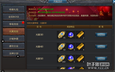 四、光翼竞技:开服第2天开启,升级到相应光翼阶数即可领取相应返利羽毛,光翼升级最大收益!!
