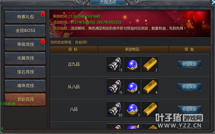 七、官职竞技:开服第5天开启,升级到相应官职阶数即可领取相应返利声望卷轴,官职升级最大收益!!