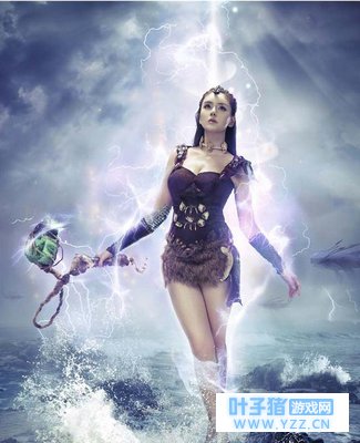 而游戏活动“四海八荒十大美女评选”冠军Rabbits则伫立在山峦之巅,手持炫色长矛,演绎超凡绝伦的女战神。
