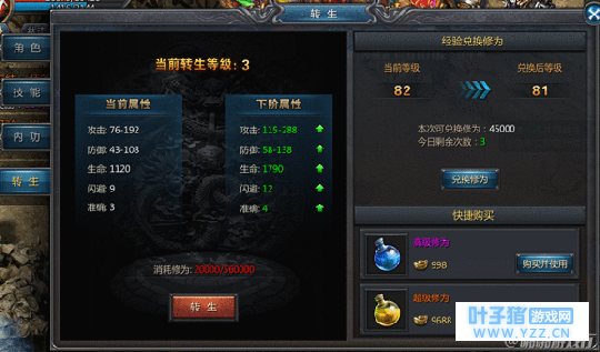 玩家在80级可开启转生系统,通过点击角色按钮可进入转生界面: 转生分为12个等级,等级越高可获得更多的各项属性加成,极大的提升角色的战斗力。每个转生等级均有相对应的转生装备,不仅拥有比普通装备更为华丽的外形,更有着十分强大的属性。转生等级提升需要消耗转生修为,可以通过活动、礼包、商城等得到的修为丹来获取修为,也可通过消耗经验和金币兑换大量修为。经过转生的角色可以进入更为危险的转生地图,与更强大的头目战斗,获得更为极品的装备与丰厚的稀有材料。
