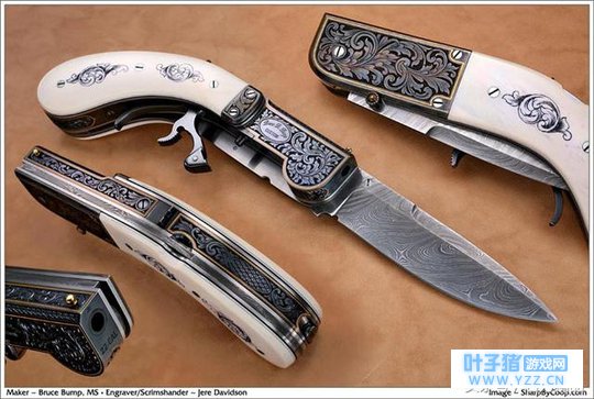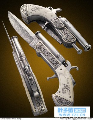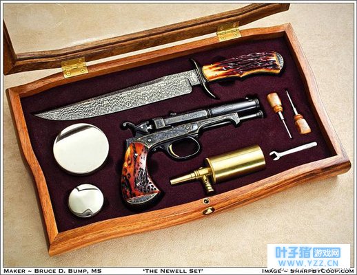 布鲁斯从1998起就一直是个全职的刀具制造者。布鲁斯在黑火药手枪和刀组合的兴趣开始于2000叶展期间当布鲁斯看到大猎刀和手枪安装在刀片的一侧,Wade Colter已经显示燧发。这是一件很有美感和艺术性的事。布鲁斯开始查阅刀和枪的历史书,发现工匠们一发明火药就制造了“双重威胁”的武器。在那些日子里,枪支和火药是如此的不可靠,以至于他们用刀片作为备用……或者也许是另一种方法?无论如何,布鲁斯爱上了刀和枪的组合。