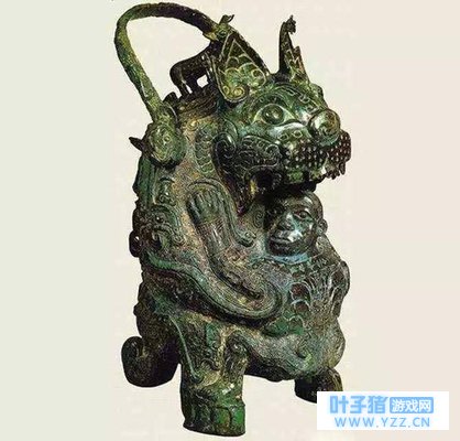 鼎耳外侧的虎食人 猛虎食人的题材在这个时期的青铜器中也非常常见。目前收藏于日本的重要文物猛虎食人卣,更是把猛虎食人这个题材直接做成了一个立体的酒壶。