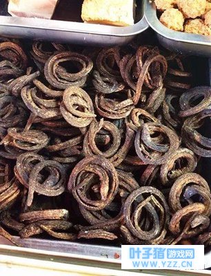 这个一圈一圈的东西就是干黄膳,是当地最传统的吃法; 当地的花腰傣族家妇女,从田间捉来黄鳝,把它放在火塘上烘烤至黄,再剖腹去肠,把黄鳝洗干净后抹上适量的辣椒面、食盐,穿在树枝上晒干,就可以吃上一年了;它是傣家人待客必备的一道下酒好菜。