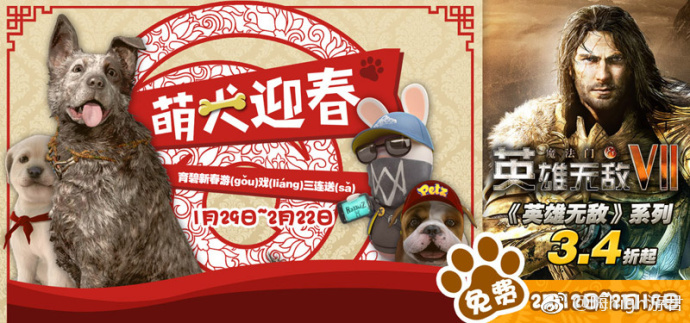【育碧中文商城开启狗年折扣】为庆祝农历狗年的到来,从2月12日17:00至2月22日12:00,育碧中文商城全场游戏将有不同程度的折扣优惠,超过百款游戏、季票以及DLC等相关产品最低2.5折。除了三款免费游戏送出外,超过百款游戏、季票以及DLC等相关产品最低2.5折。
