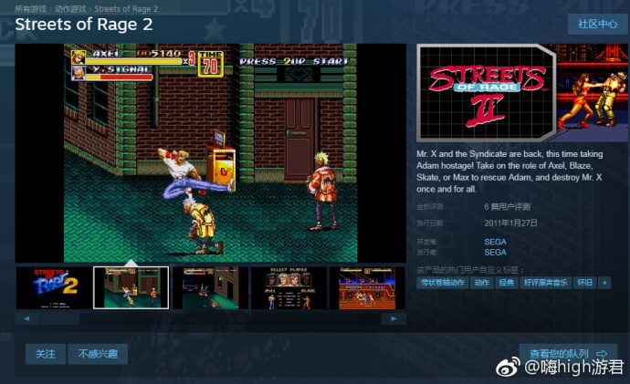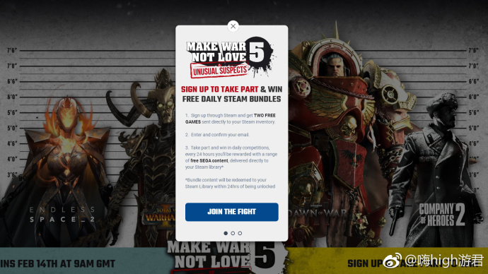 世嘉开启“反情人节”活动“只要战争不要爱”,登陆活动官方,用Steam账号登陆,即可立即获取2款经典游戏《忍者的复仇》,《怒之铁拳》。游戏库加一的是《SEGA Mega Drive and Genesis Classics》,2款游戏在DLC里。未来还会赠送《英雄连》、《埃尔法协议》、《变节行动》、《战锤:全面战争》DLC等游戏。注意进入官网需要输入出生日期,别输太早。