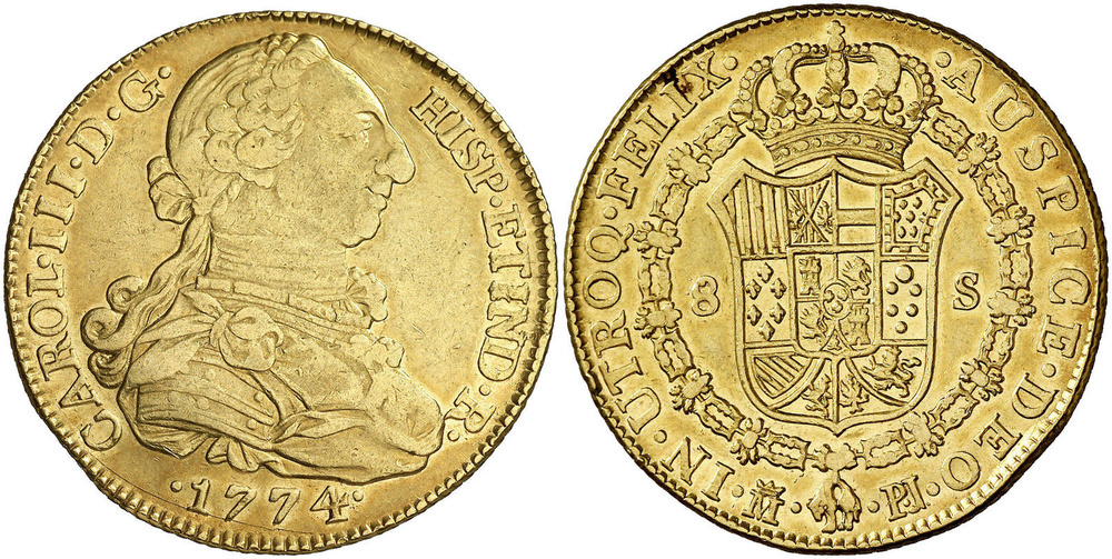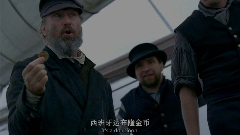 说着,他把一枚锃亮的大金币对着太阳举起来,“伙计们,这是个西班牙金币,值十六块大洋。瞧见了没有?”《白鲸记》,第三十六章 达布隆Doubloon,是当时新大陆流行的一种西班牙金币,尤其在英属北美殖民地流行。语出西班牙语doblón,意思是双份double,价值两个埃斯库多escudo金币,或者32个里亚尔real银币,重6.867克或6.766克,含92%的黄金。金币一面铸有费迪南国王或伊莎贝拉女王的头像,另一面铸有西班牙王室的徽标。