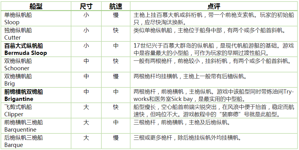 游戏教程部分的“裴廓德”号,就是一艘航速极高的飞剪式帆船。 游戏中共有9种船型,详见下表。