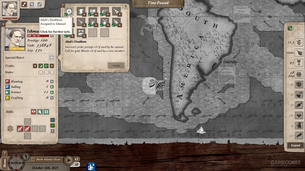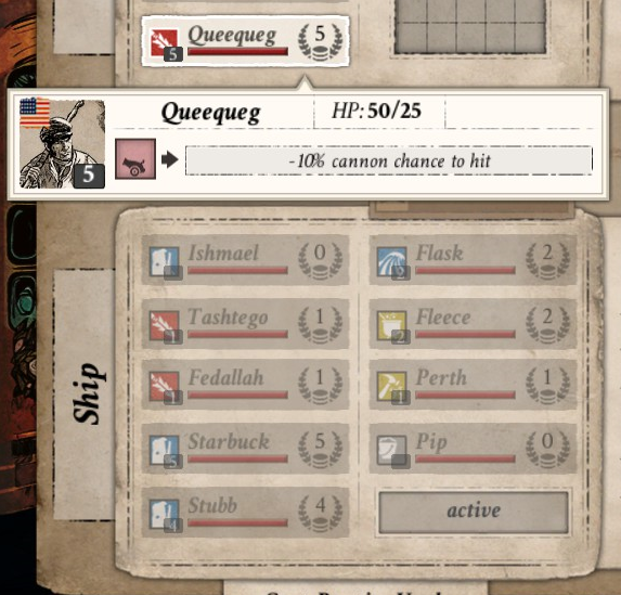(初始教程剧情截图,可以看到《白鲸记》原著的大半人物,包括标枪手魁魁格、主角以实玛利、大副斯达巴克-某咖啡品牌出处于此、二副斯塔布、三副弗拉斯克、船仆皮普等人)