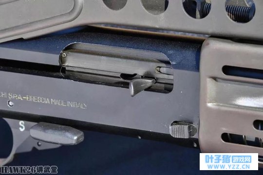 这是SPAS 12的抛壳窗,注意右下方的弹仓阻隔按钮。按下这个按钮后,射手可以直接向弹膛内装填其他型号的弹药。