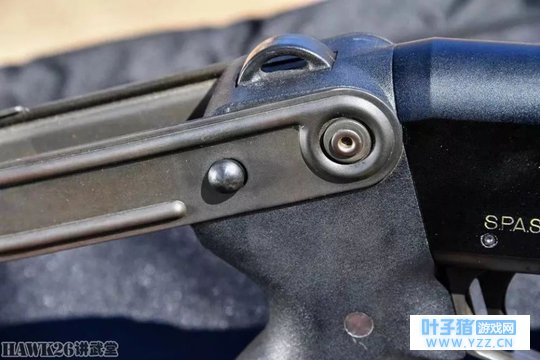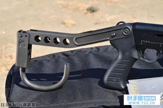 SPAS 12的金属折叠枪托,尾部的钩子可以根据需要进行旋转。如果够有劲儿,可以将钩子转过来,单手进行射击。但是并不建议这样做,枪托很快会磨损的。