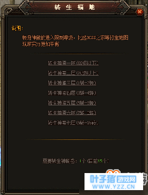 转生神殿分为7层,不同转生等级可进入对应的转生神殿地图,进入需要消耗转生神殿卷。击杀转生神殿BOSS可获得极品装备。