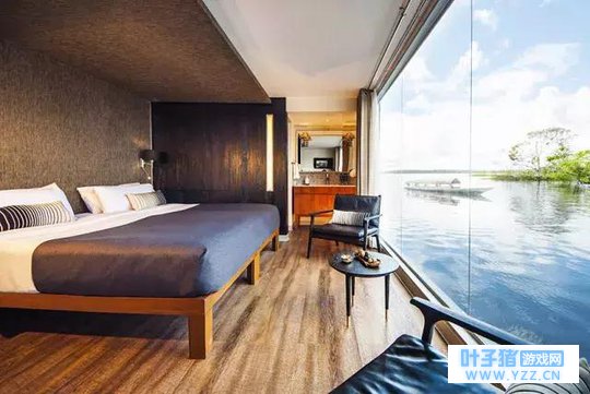 这艘河轮的甲板上并无“船”由窄至宽的流线形状形状,舱房也没有小小的舷窗,每个房间都拥有绝对宽阔的落地窗,河轮更像是移动的联排别墅,确保客人在舱内外都能随时欣赏到亚马逊雨林壮阔的景致。