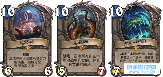 但是在发售的当天,逼格满满的 克苏恩 就被玩家无情的抛弃,他实在是太僵硬,顺手一条龙,逆手卡到爆炸,(UP是这个版本入的,在加基森曾经退过一段,具体原因嘛....都知道的)当时真没有多少人玩克苏恩的,全是奇迹贼,瓦王战 恩佐斯 根本没在标准蹦跶,直接被狂野捉去了,毕竟狂野优质亡语贼多,这张卡的优势体现出来了,在后来的狗头人版本的初期“魔块术”拿了出来,返场稳得一批,毕竟9/3/9是亡语啊,狗蛋DK不稳定,复活了是全针七子,恩佐斯凭借稳定且强大的后期反场能力(毕竟6个9/3/9谁看都崩溃)被狗蛋带上了传说 “导演” 尤格—萨隆 这张出来的时候其实并没有特别受到关注,当时都是尽量降低随机性而傻龙随机性太强而不被看好,但在中速猎和龙战开始崛起。同时人们发现,诶这个傻龙好像不只是娱乐卡,他的收益好像大部分时候都是正的诶。没有什么导演翻不了的盘,遇事不决上导演,运气好的话,他能解场,铺场,挂奥秘(蘑菇头,斜刘海,杀马特啥都有)回血,加甲,过牌,斩杀。早期导演其实和这个版本早期的“我,牙尖爪利”一样,就算不小心玩死自己还是照样会放完。其实傻龙被削弱过的,后来更是封顶20,火妖法和超生德都带这张卡,后来都成了T1卡组 本期主角“亚煞极” 时间来到了卡拉赞,导演依旧猖狂,克苏恩战由于洒满崛起逐渐退出了历史舞台,正统克苏恩卡组基本宣告灭亡。恩佐斯依旧在狂野闷声发大财。而亚煞极,出现了希望的曙光,新卡巴内斯由于其独特效果,能和亚煞极配合从而在4费拉出1010亚煞极劝退对手,这一独特卡组被命名为极巴卡组,代表是职业卡有复活的牧师和可以弃暗投明的术士,亚煞极终于进了个勉强可以上分的卡组,但仍旧是娱乐。 在后来的冰封王座,有一万个声音在召唤亚煞极,德的终极感染,牧师的4费复活和暗影精华,让大哥牧和大哥德这两个本来搞笑的卡组瞬间成为了有一战之力的卡组。狂野的星界德甚至成为了可以上传说的卡组,而大哥牧,在标准狂野都是牧师胜率比较高的卡组,(第一应该是走A牧吧)