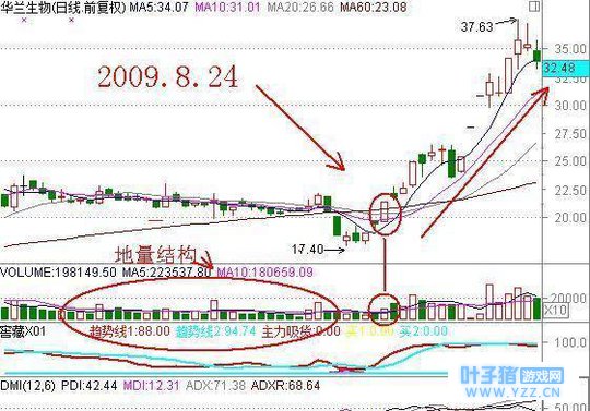 002007,华兰生物,2009年8月24日,放量攻击涨停,一举突破所有均线压制,出现芙蓉出水涨停板,注意这个地方为什么当天必须强势介入?大家看涨停前以小K线的形式整理了很长时间,然后缩量下跌挖了小坑,可谓整理极其充分,陷阱相当完美,然后才出现了芙蓉出水涨停板。 实战范例二: