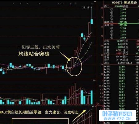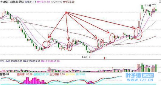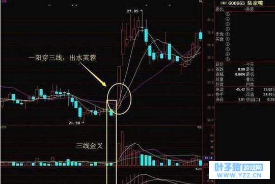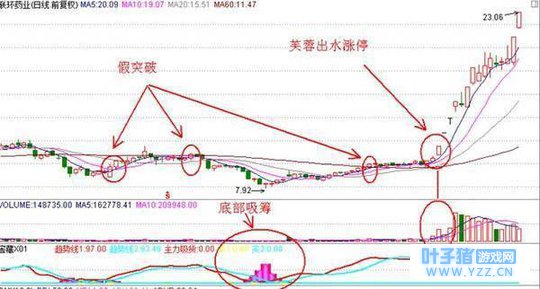 图形特征: (1)当股价长期在季均线之下滑跌,有一天突然放量冲过季均线并能收盘在季均线之上,这一根阳线称为出水芙蓉。 (2)股价长期在季均线之下横向震荡,有一天突然放量冲过季均线并能收盘在季均线之上,这一根阳线称为出水芙蓉。 (3)有时股价分几次上冲季均线,其中有一根阳线最终能站稳在季均线之上,这根阳线也称为出水芙蓉。 “出水芙蓉”的特点: 1、唯一性。也就是说在股价长期下跌的过程中间,第一天出来,只有这一天没有第二天。出水芙蓉确实是捕捉股价底部启动一瞬间的一个很好的参照物。出水芙蓉带动股价的长期走势。 2、可靠线、也就是股价在冲破了季均线系统以后,在那里作个买入点,以后再次下跌造成重大损失的可能性不大。也就是说它具有某种操作的可靠性,赢利的可靠性。 “出水芙蓉”操作要点: 1、5日均线向上穿越10日均线,同时20日均线向上,说明股价上涨可能极大。 2、股价回抽至5日均线附近时低吸, 5日均线向上穿越20日均线,可加码。 3、成交配合是关键,长阳线对应的成交量必须明显放大。 4、一根长阳线突破三根中期均线。 5、股价前期最好经过充分的调整或下跌;