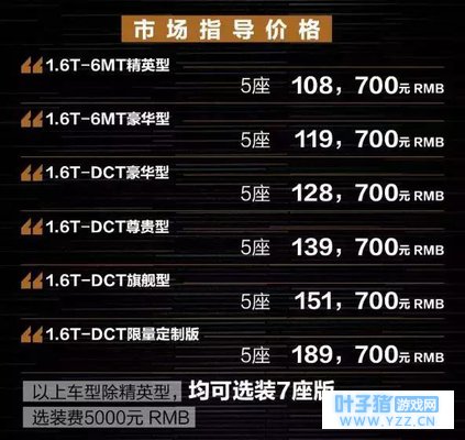 本次华晨中华V7共推出5款全新车型,包括1.6TMT精英型、1.6TMT豪华型、1.6TDCT豪华型、1.6TDCT尊贵型、1.6TDCT旗舰型,全系搭载宝马授权生产的发动机,所有车型提供5座/7座版本可选,官方指导价10.87万元-15.17万元。此外,华晨中华V7此次还特别推出了1.6TDCT限量定制版!售价18.97万元。华晨中华V7以天生强大的豪华SUV产品力、自主车的价格向自主高端SUV市场发起凌厉的降维绝杀攻击!