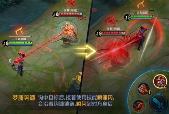 该技能钩中后激活,玄策沿钩镰锁链瞬镰闪到对方身后,瞬镰闪的路径上对所有单位造成物理伤害。