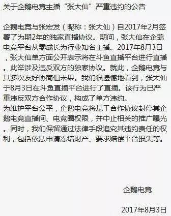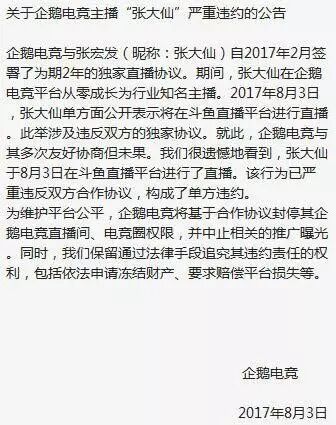 一则违约声明将事件推向高潮,企鹅表示要追究责任,当然对于违约的处理大家都能理解。就连张大仙本人也是表示接受: