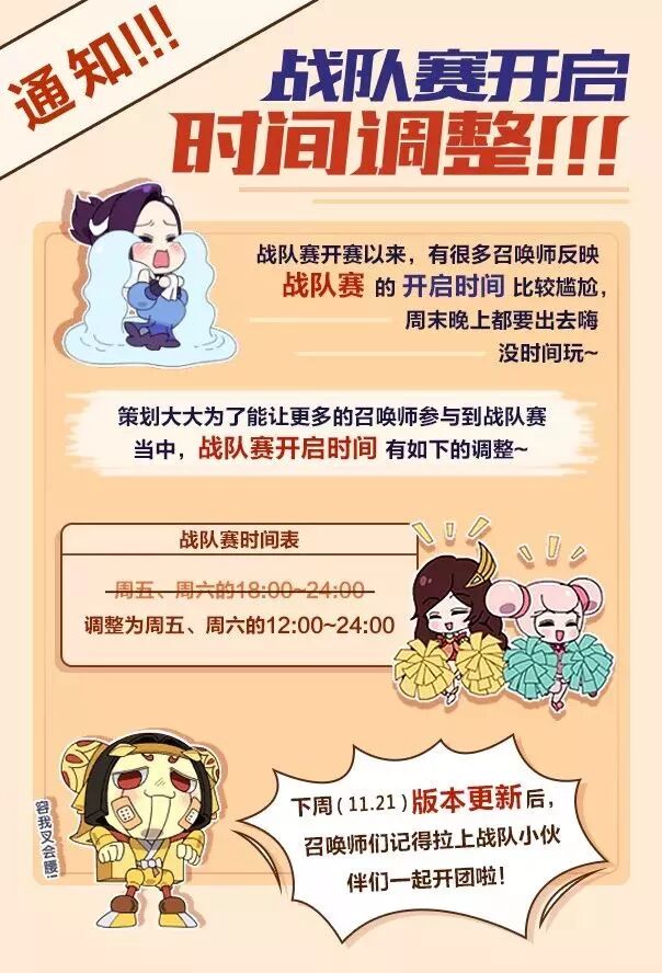 除了女娲大人的爆料之外,还有一个好消息要告诉大家哟!从下周五(11月24日)开始,战队赛开启时间调整为12:00-24:00,各位召唤师快来了解一下吧~